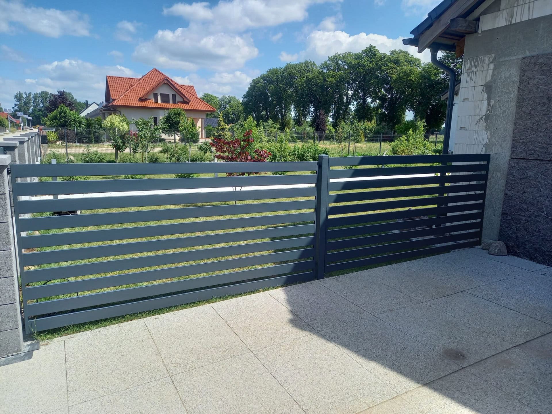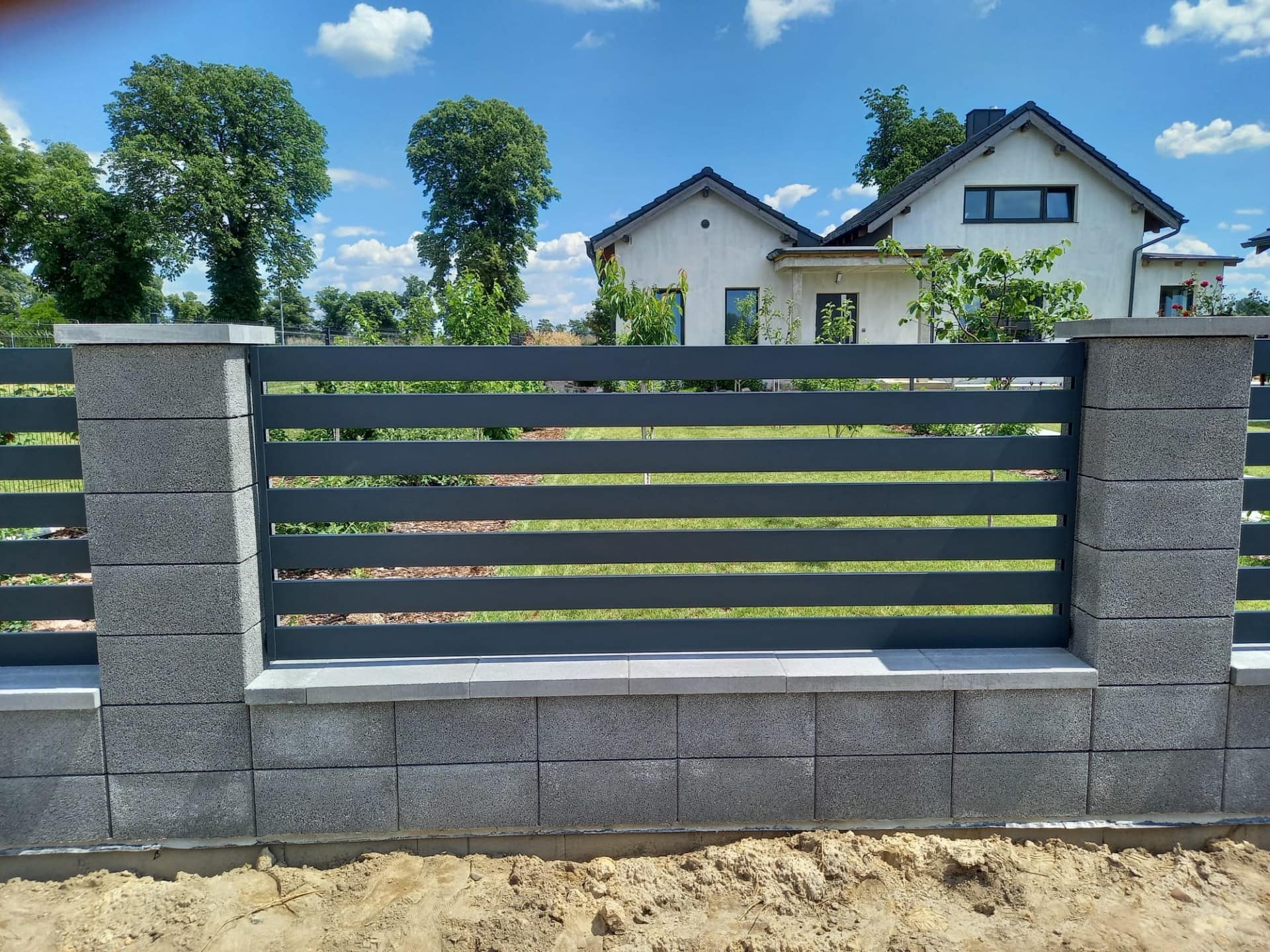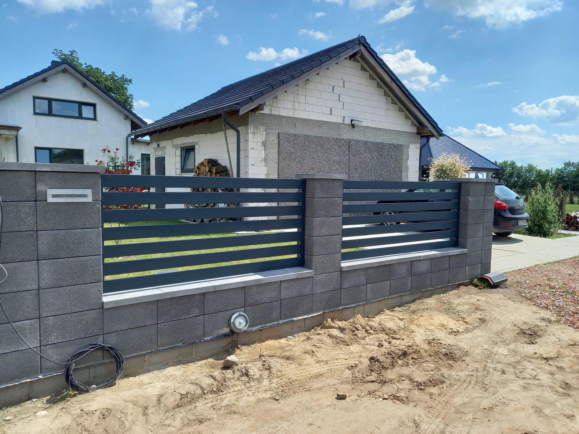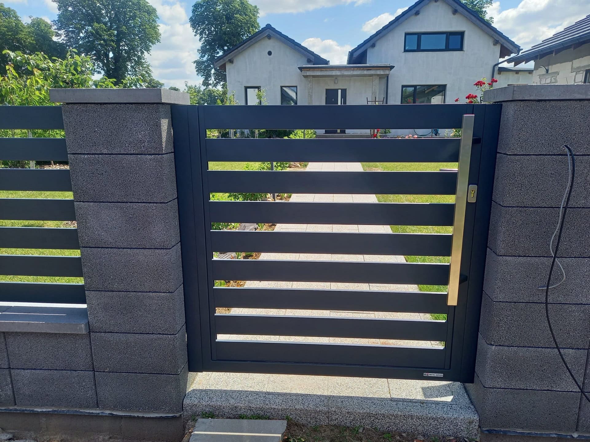 Szerokie, poziome panele ogrodzeniowe z metalu, czarne, na betonowej podstawie - ogrodzenie Metal-Serwis Obrzycko. Przedstawia nowoczesne, solidne ogrodzenie poziome z metalowych lameli, zamontowane na betonowych słupkach. - ogrodzenie Metal-Serwis Obrzycko. Przedstawione nowoczesne ogrodzenie palisadowe z poziomymi panelami i betonowymi słupkami, zapewniające solidną ochronę i estetykę - ogrodzenie Metal-. Przedłużenie nowoczesnego ogrodzenia poziomego z czarnych profili stalowych. - ogrodzenie Metal-Serwis Obrzycko. Opisz dokładnie co widzisz na zdjęciu (rodzaj ogrodzenia, materiał). Obowiązkowo na końcu każdego opisu dodaj frazę: „- ogrodzenie Metal-Serwis Obrzyc. Solidne, czarne ogrodzenie palisadowe z metalowych paneli, idealne do nowoczesnych posesji - ogrodzenie Metal-Serwis Obrzycko. Przedstawione nowoczesne ogrodzenie panelowe z metalowymi elementami, solidne i trwałe, idealne do zabezpieczenia posesji - ogrodzenie Metal-Serwis Ob. Nowoczesna brama panelowa z czarnego metalu, zamontowana na ogrodzeniu z paneli metalowych, solidne wykonanie - ogrodzenie Metal-Serwis Obrzycko.