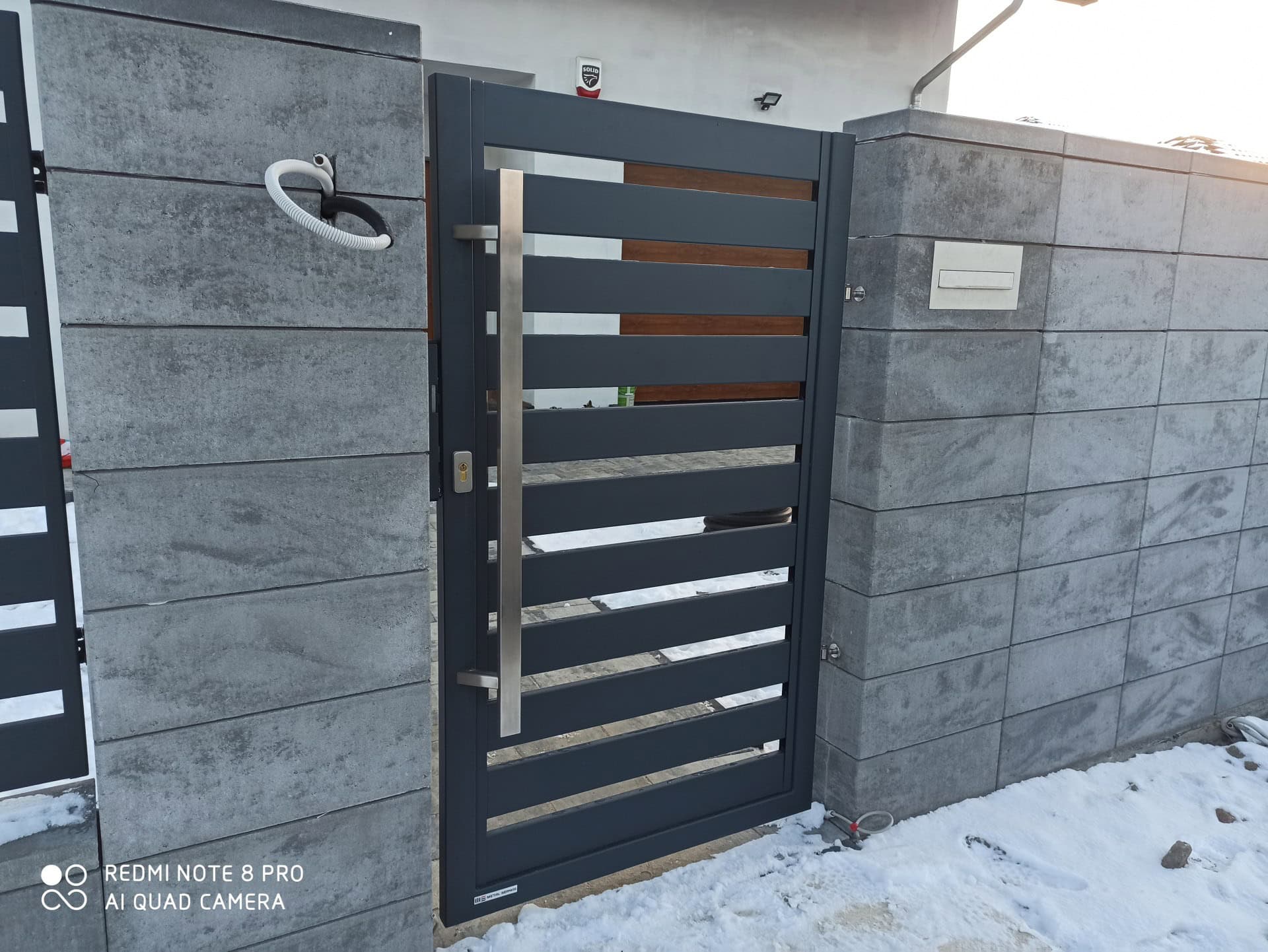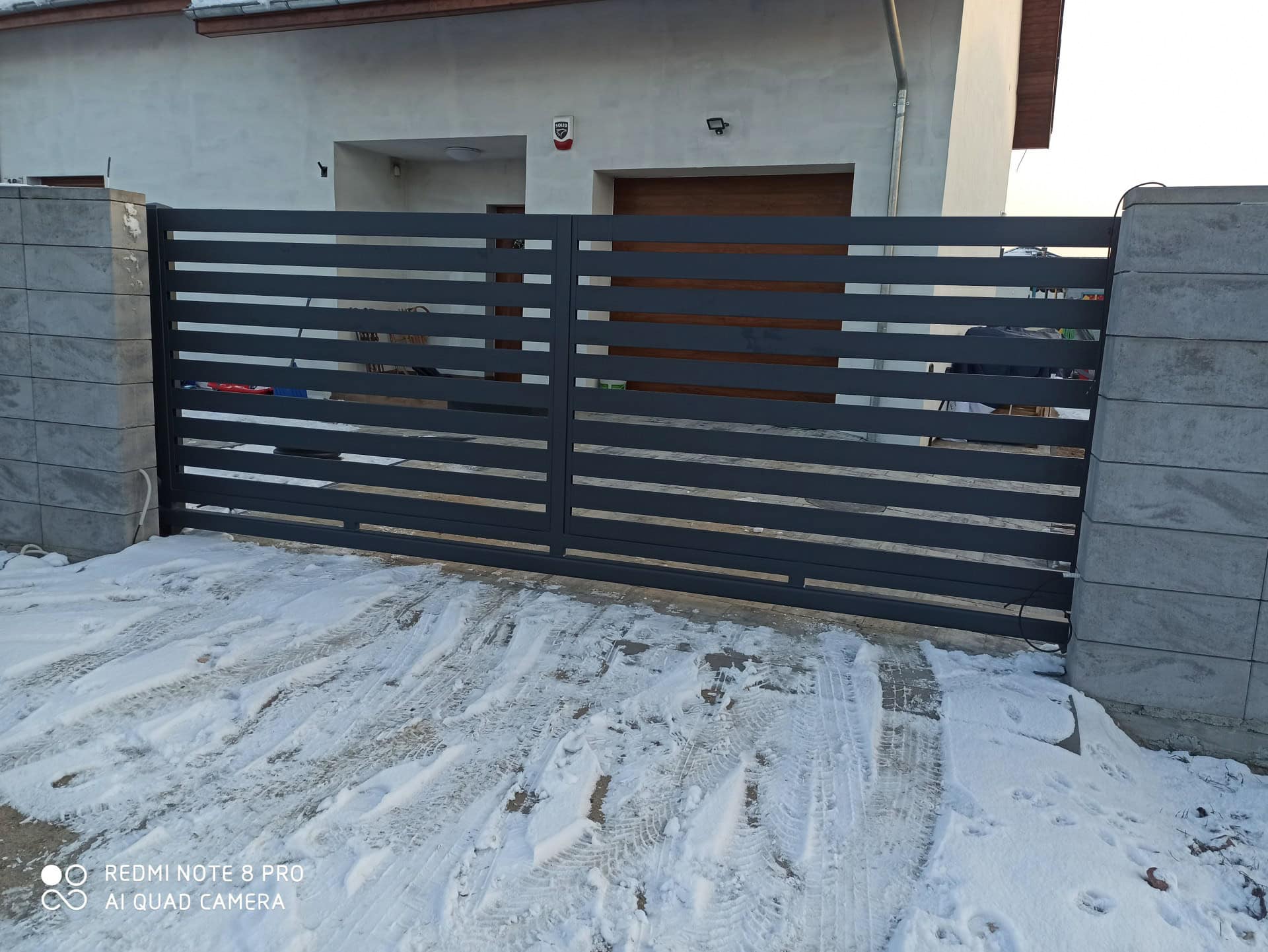 Ta nowoczesna realizacja stanowi idealne połączenie surowości betonu architektonicznego z elegancją ciemnej, poziomej palisady, tworząc spójną i reprezentacyjną wizytówkę posesji. Zastosowanie wielkoformatowych, gładkich bloczków betonowych w jasnoszarym odcieniu nadaje konstrukcji monumentalny charakter, który świetnie kontrastuje z ażurowymi przęsłami. Funkcjonalność systemu podkreśla minimalistyczna furtka wyposażona w wysoki, pionowy pochwyt ze stali nierdzewnej oraz dyskretnie zintegrowany system automatyki bramowej z fotokomórkami bezpieczeństwa. Całość została zaprojektowana z dbałością o detale, zapewniając domownikom wysoki poziom prywatności dzięki gęstemu układowi profili, przy jednoczesnym zachowaniu lekkiej i nowoczesnej formy, która idealnie dopełnia bryłę budynku.