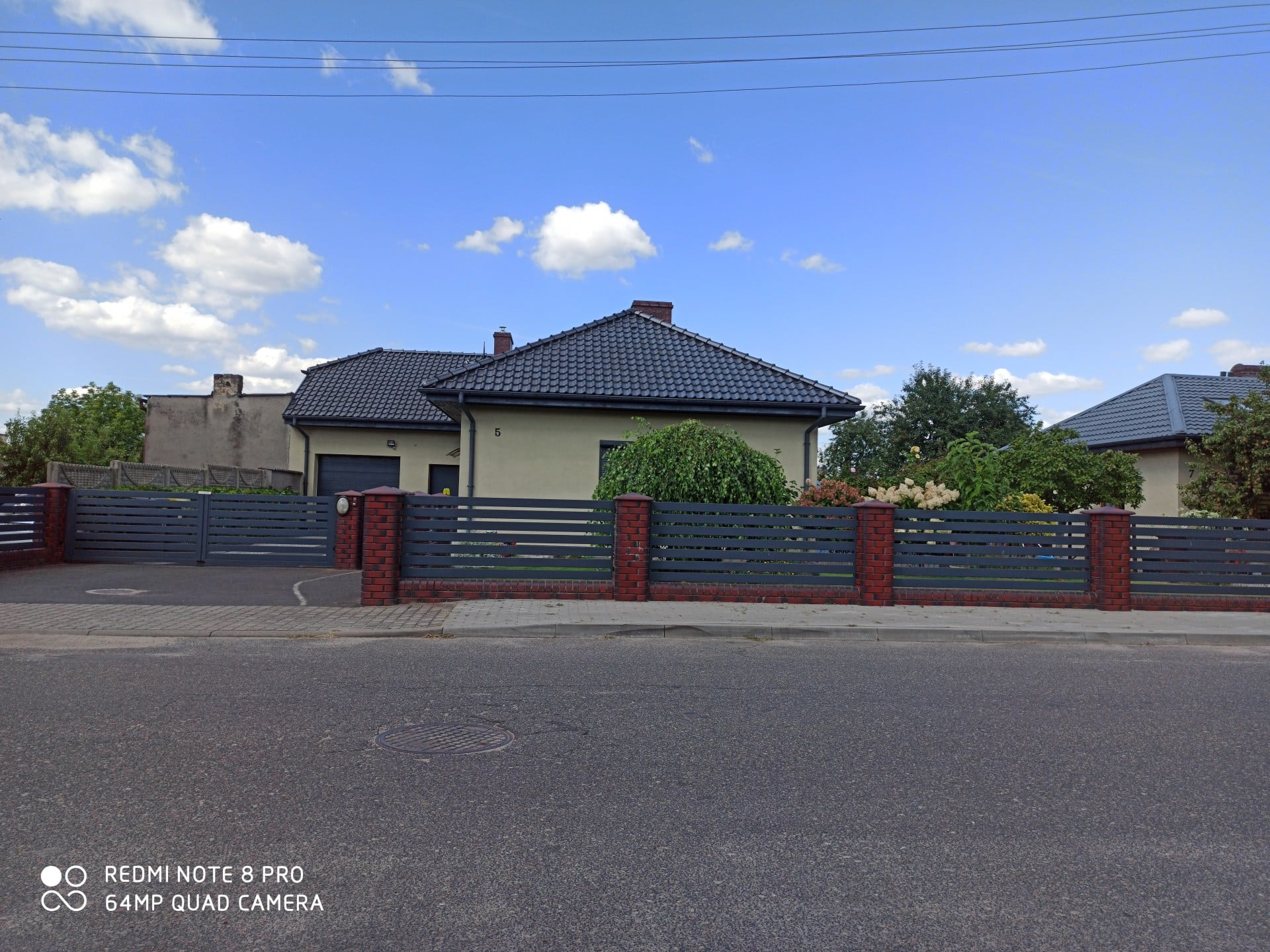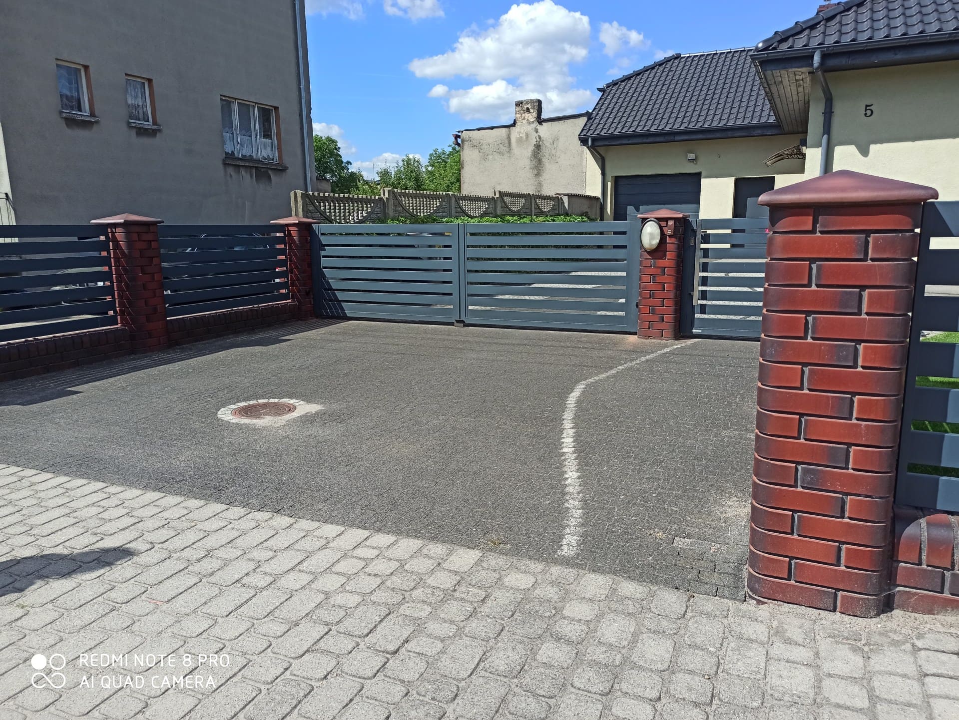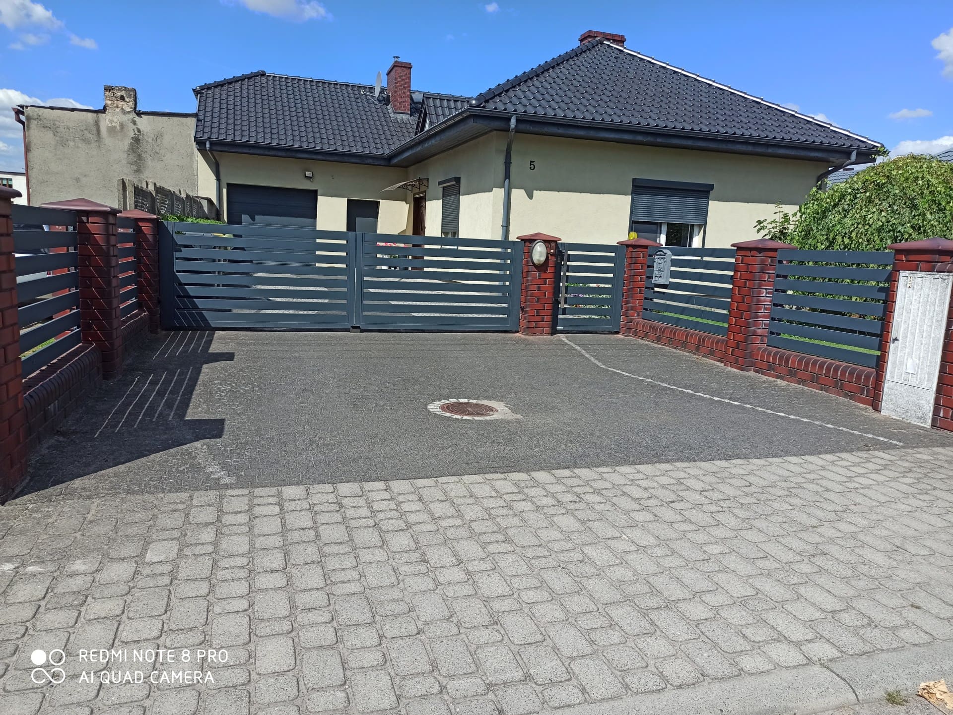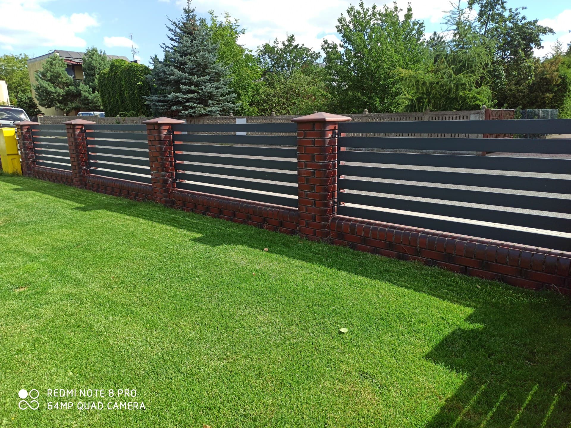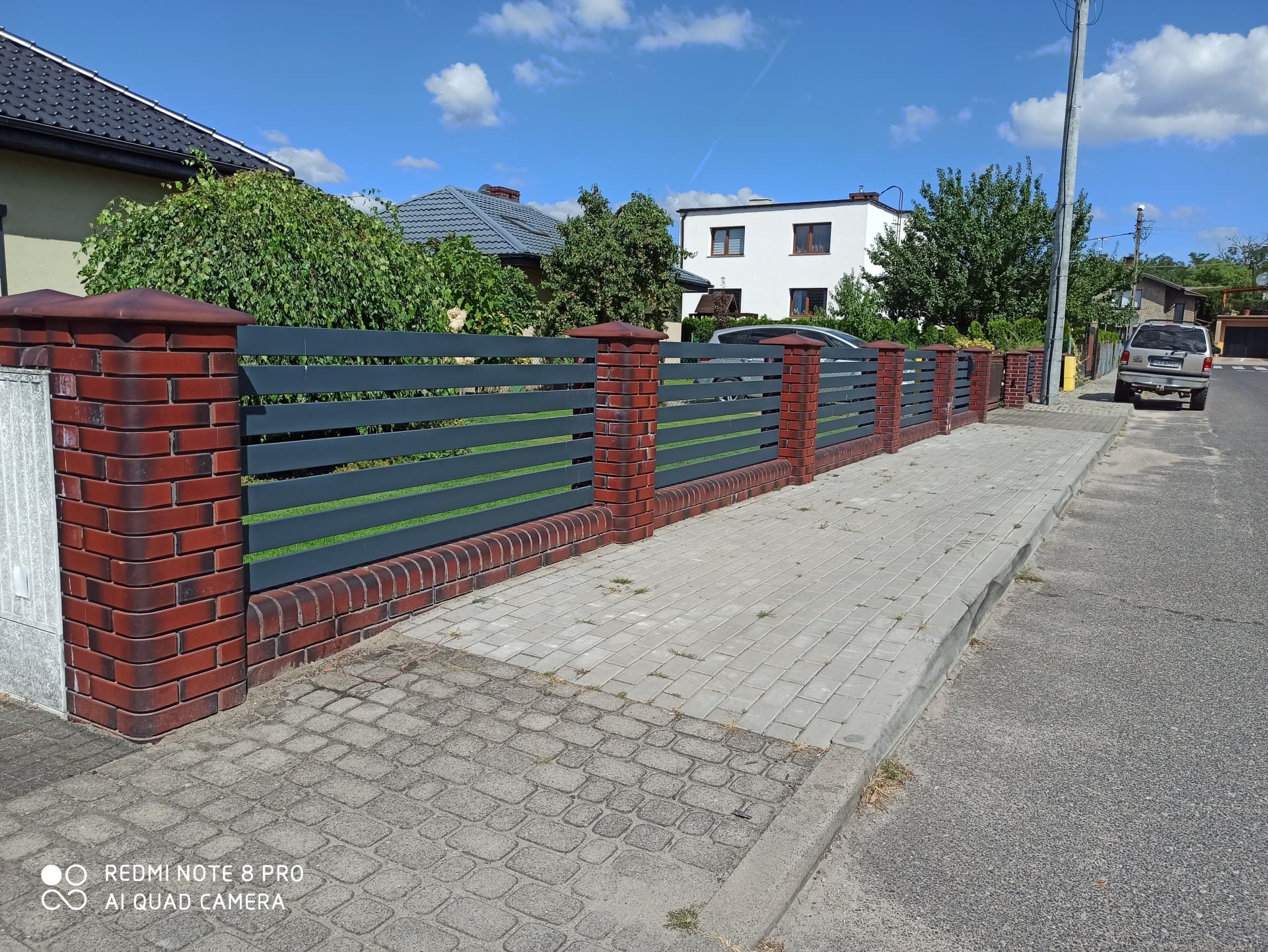 Realizacja ogrodzenia, która idealnie balansuje między tradycją a nowoczesnością. Solidne, klinkierowe słupki oraz podmurówka w odcieniach głębokiej czerwieni i brązu stanowią stabilną bazę dla lekko wyglądających przęseł palisadowych. Poziomy układ lameli w kolorze grafitowym nadaje posesji nowoczesnego sznytu i zapewnia domownikom odpowiedni poziom prywatności. Całość dopełniają dopasowane stylistycznie akcesoria: skrzynka na listy wkomponowana w przęsło oraz oświetlenie na słupkach.